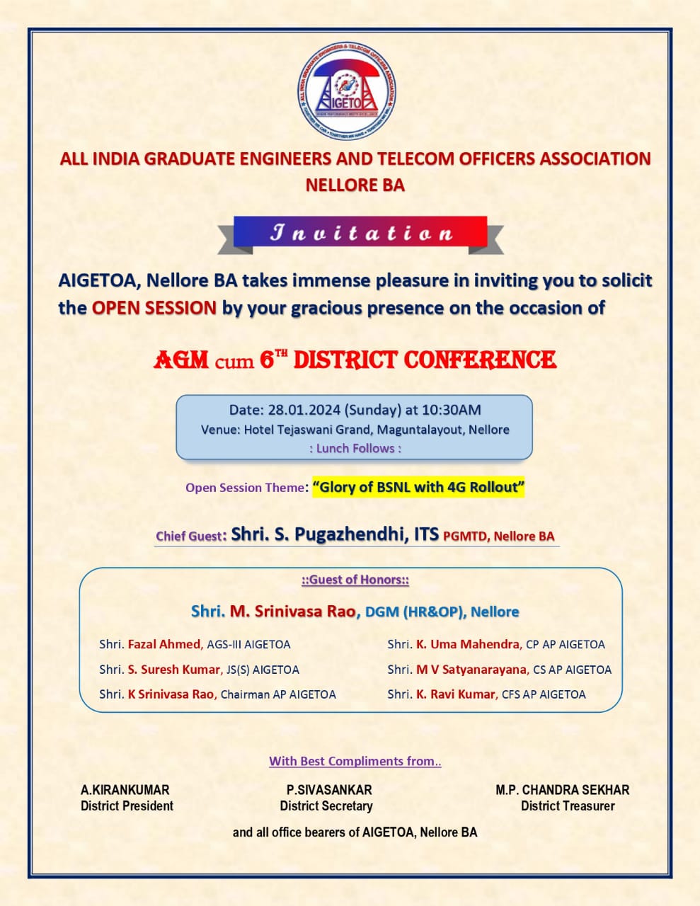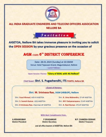 January 24, 2024 HomeMeetingsNotice for AGM Cum 6th District Conference to be held on 28.01.2024 organized by Nellore BA AIGETOA team Notice for AGM Cum 6th District Conference to be held on 28.01.2024 organized by Nellore BA AIGETOA team By admin Meetings 0 Comments Click for Notice for AGM&DC Nellore BA Total Page Visits: 1007 - Today Page Visits: 1 Related Posts Invitation to Tripartite Meeting from DoT – “A Meeting of DoT, BSNL & Association side AIGETOA & BTEU on 16th Feb 2024 for addressing the HR concerns in BSNL” Notice for Online meeting with CEC, DP, DS, DFS and Collegium members of AIGETOA, AP Circle Letter to CGMT for urgent Intervention Required – Unjust Salary Deduction of M.Venkateswararao,SDE, GTR BA