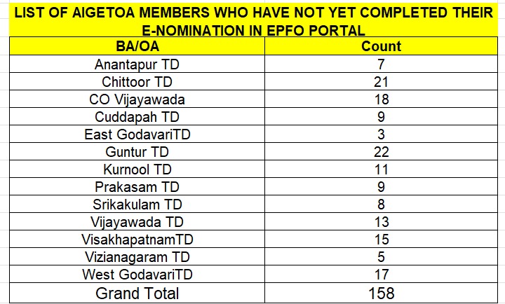 The AO (HCM), Circle Office Vijayawada, has shared a list of AIGETOA members who have not yet completed the E-Nomination process in the EPFO portal.